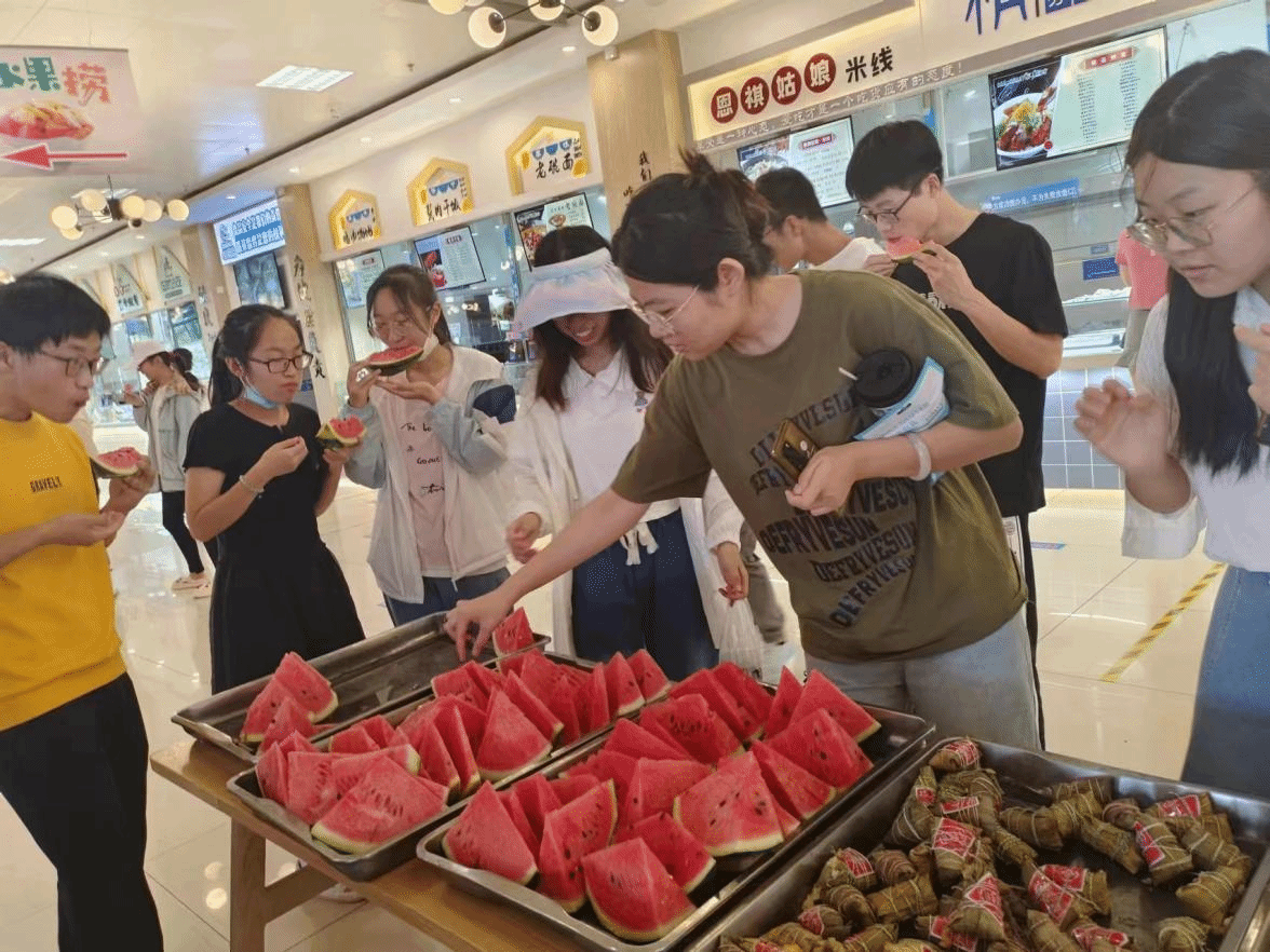 春华苑二楼的食堂阿姨和同学们一起热情洋溢的包粽子、发西瓜,欢声笑语中为酷夏增添了一丝清爽。