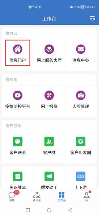第一步:登录企业微信,打开工作台,进入信息门户