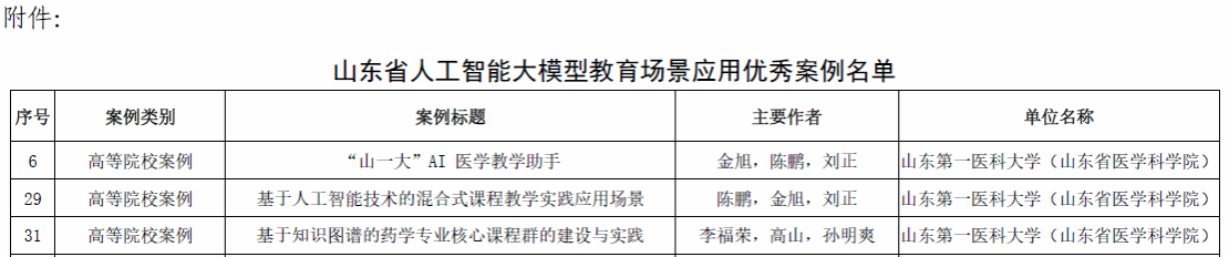 近日,山东省电化教育馆公布了山东省人工智能大模型教育场景应用优秀案例名单,校(院)推送的三项案例都成功获批,其中“基于知识图谱的药学专业核心课程群的建设与实践”作为优秀案例向国家电教馆推荐。