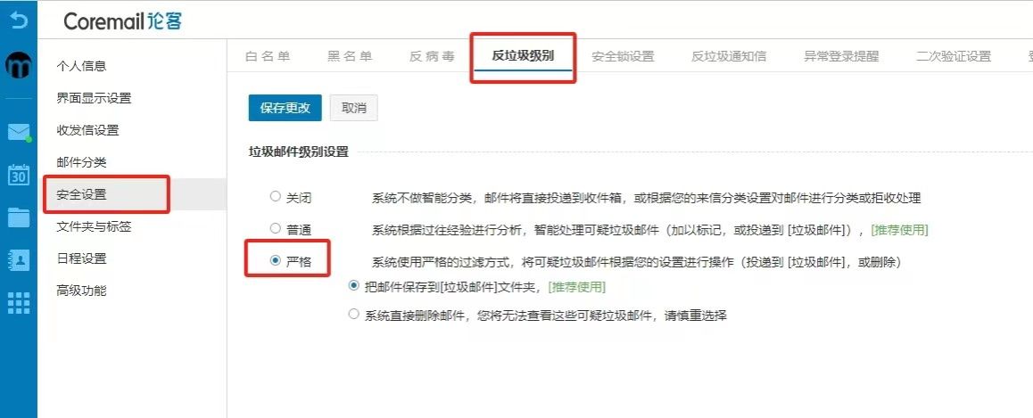 4.用户可自行检查反垃圾级别设置,将其调整为严格处理。点击个人图像->个人设置->安全设置