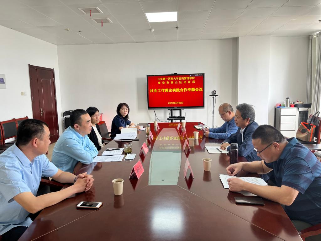 4月26日下午,医药管理学院院长陈士福、副院长陈海玉、社会工作系主任孙奎立和教学管理办公室主任高娟一行四人赴泰山区民政局洽谈实践教学基地合作事宜。