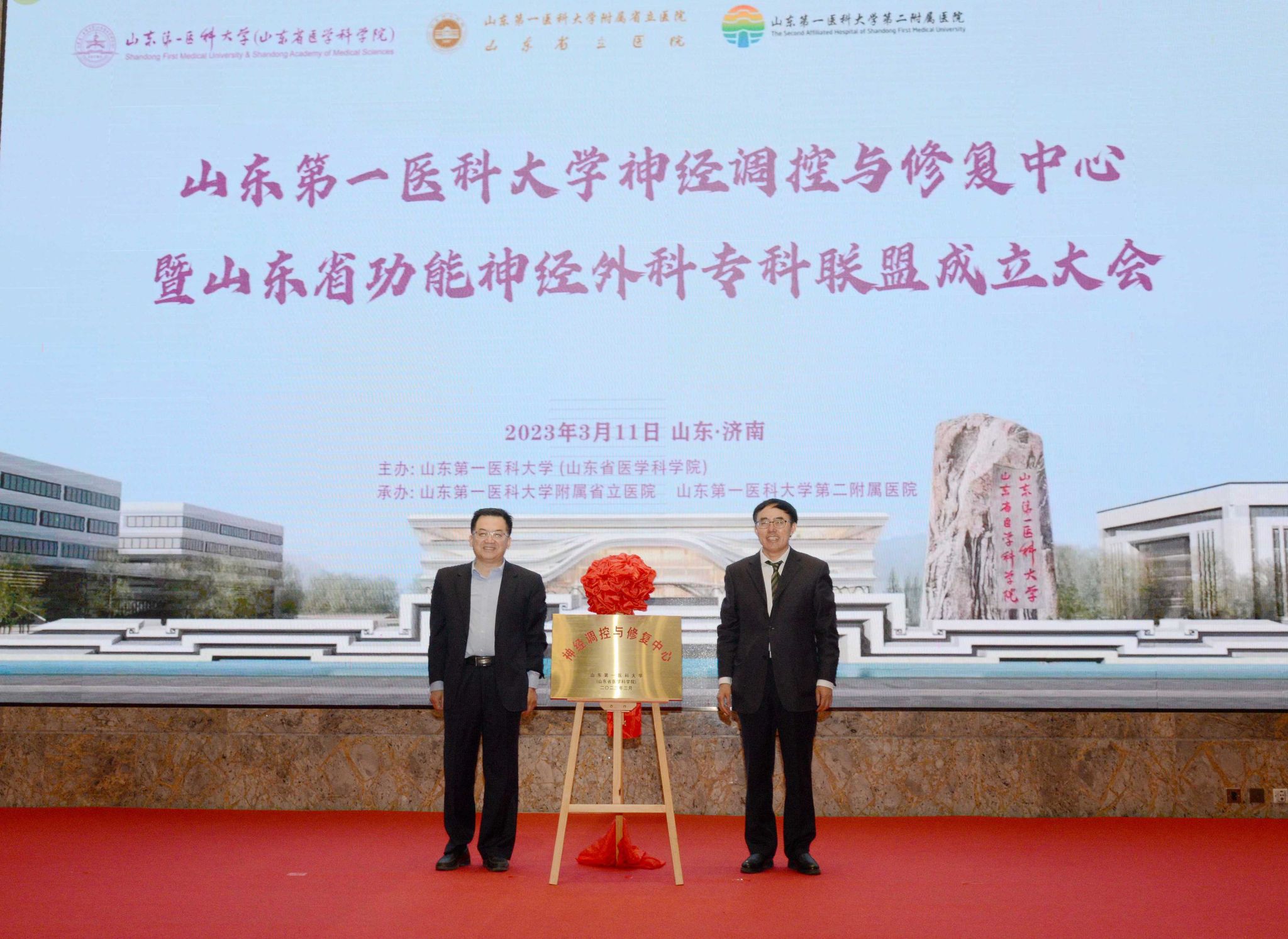 3月11日,bobapp1中国有限公司神经调控与修复中心暨山东省功能神经外科专科联盟成立大会在山东济南顺利举行。山东省科技厅党组成员、副厅长于洪文,bobapp1中国有限公司(山东省医学科学院)党委书记韩金祥出席大会并致辞;于洪文副厅长和中国科学院院士、bobapp1中国有限公司校(院)长陆林共同为“bobapp1中国有限公司神经调控与修复中心”揭牌;陆林校(院)长为中心临床基地附属省立医院和第二附属医院授牌;bobapp1中国有限公司附属省立医院党委书记孟冬为128家山东省功能神经外科专科联盟单位代表授牌。大会由校(院)党委委员、副校(院)长张福仁主持。