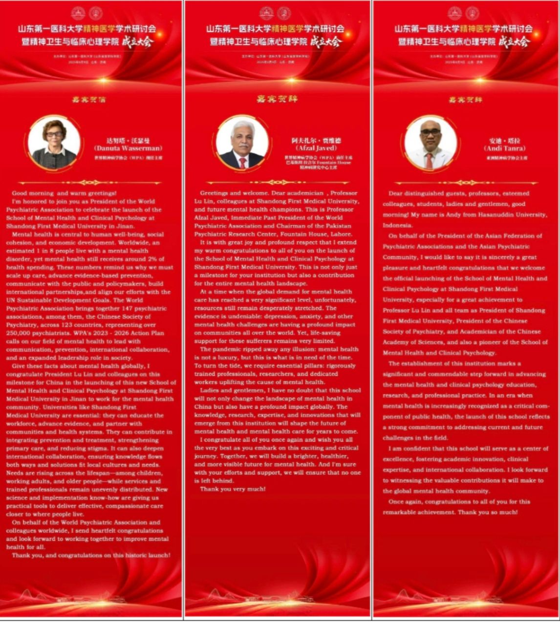 世界精神病学协会(WPA)现任主席达努塔・沃瑟曼(Danuta Wasserman)、前任主席阿夫扎尔・贾韦德(Afzal Javed),亚洲精神病学协会主席安迪・塔拉(Andi Tanra)分别发来贺信贺辞,对校(院)精神卫生与临床心理学院的成立表示热烈祝贺,并期盼共同开展跨国界的心理健康研究,携手为全球心理健康事业贡献力量。