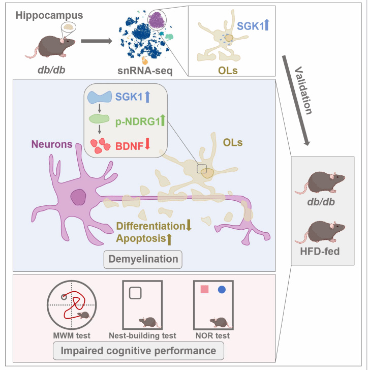 脑科学与类脑研究院殷青青/陆林团队在糖尿病相关认知功能障碍研究方面取得进展。相关成果以“SGK1驱动小鼠海马脱髓鞘和糖尿病相关的认知功能障碍(SGK1 drives hippocampal demyelination and diabetes-associated cognitive dysfunction in mice)”为题,于2025年2月17日(在线)发表于《自然通讯》(Nature Communications)杂志,论文链接:https://www.nature.com/articles/s41467-025-56854-2。