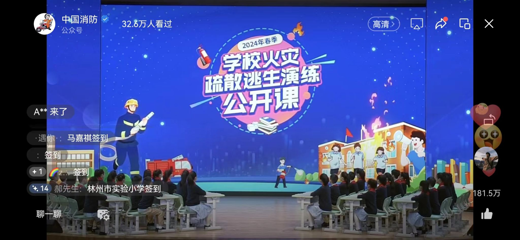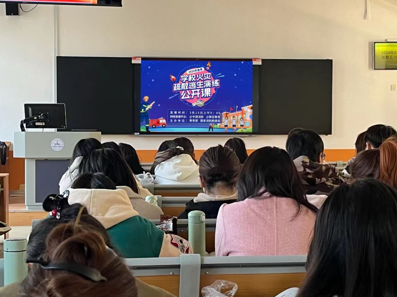 为进一步加强校园安全教育,提高师生消防安全意识和自防自救能力,创建全国文明校园,3月15日,学院组织广大师生通过“中国消防”微信公众号收看国家消防救援局、教育部联合举办的“2024年春季学校火灾疏散逃生演练公开课”。