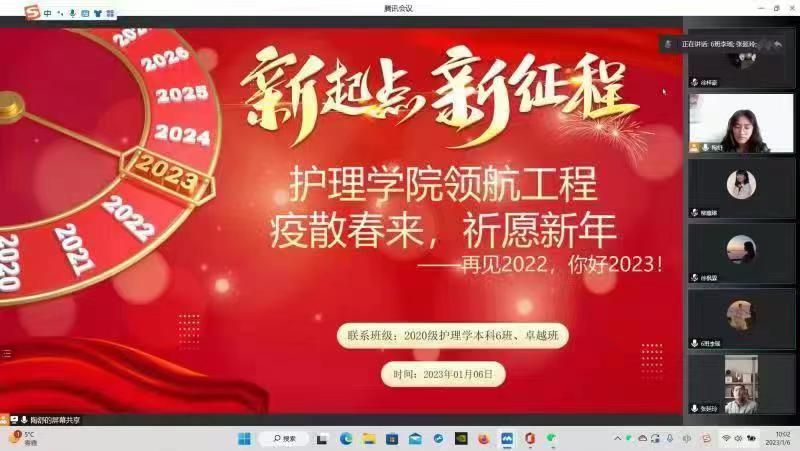 新年前夕,国家主席习近平发表了二〇二三年新年贺词。为进一步推动护理学子从新年贺词中汲取智慧和力量,2023年1月6日上午,护理学院学工党支部领航员、学院党委书记张延玲与联系班级—2020级护理学本科6班、卓越班共同开展“疫散春来,祈愿新年——再见2022,你好2023”主题领航活动。