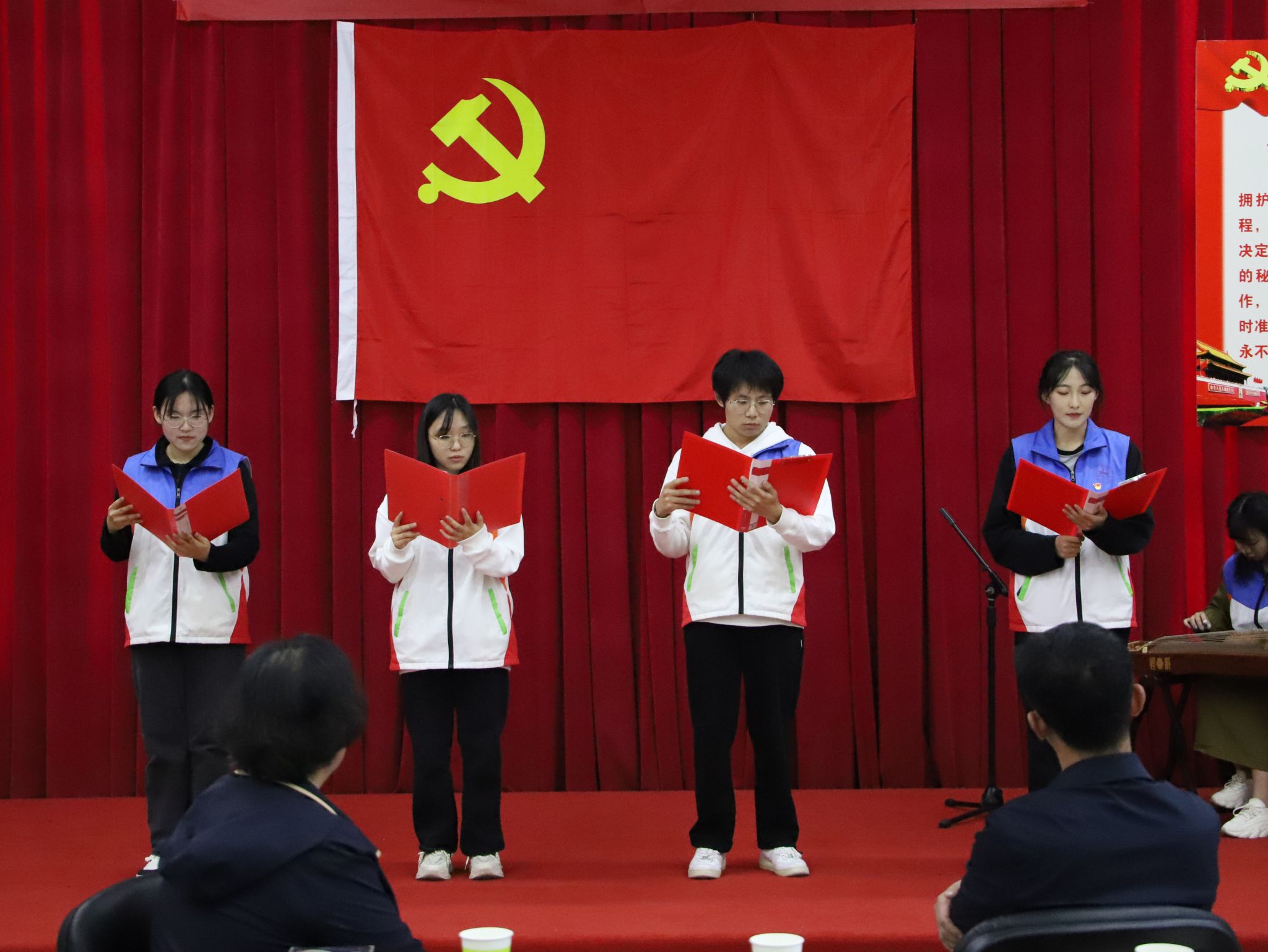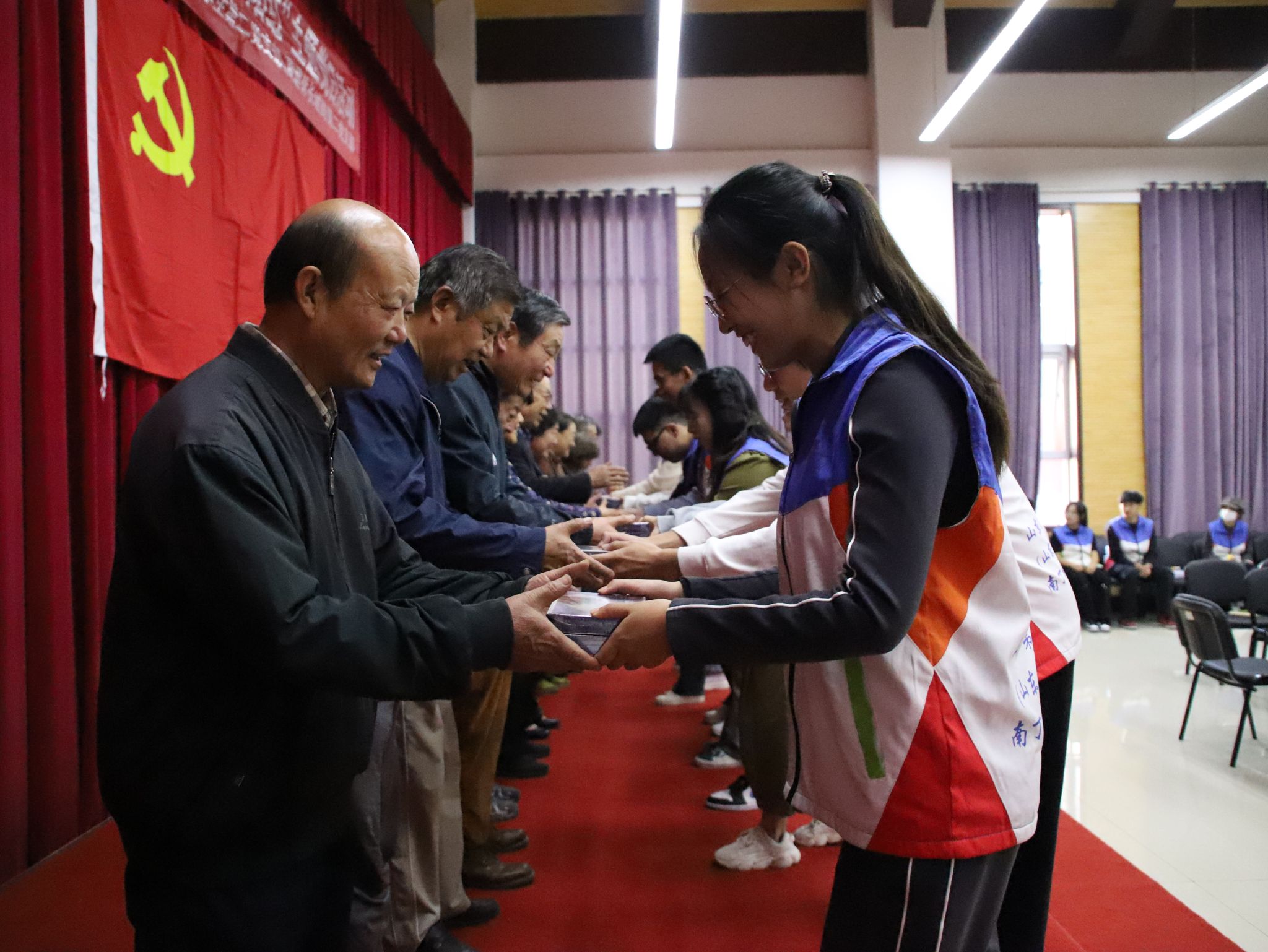 紧接着,学生党员为老党员们送上重阳节礼物,并为他们带来诗朗诵《诗意中国》。在学生党员悠扬的古筝乐曲中,四名青年党员以极具表现力和感染力的朗诵方式,抒发对党和国家的深厚情感,字字句句都蕴含着浓厚的爱国情怀和坚定的理想信念,获得了现场的阵阵掌声。