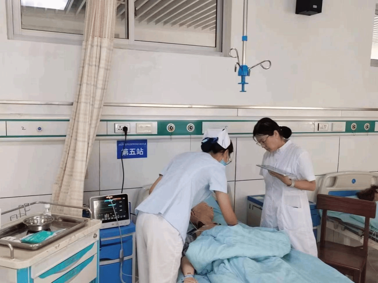 为检验培训效果,培训后通过选拔赛的方式选拔出最终进入决赛的选手共18位。决赛以中国大学生医学技术技能大赛考核方式为标准,分为A、B两赛道,重点考察学生分析与解决临床问题的能力,实行三站式客观结构化考核。比赛过程竞争激烈,紧张而有序。选手表现出良好的专业素养和稳定的心理素质,操作细致、人文关怀有温度,获得现场领导老师的充分肯定。比赛共决出A、B赛道特等奖6名,一等奖12名,二等奖若干名。