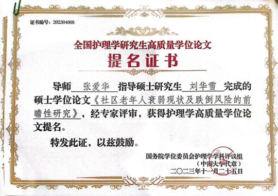 为拓宽学院教师及研究生学术视野,加强学科建设、提升护理研究生的培养质量,在张爱华院长带领下,本次大会护理学院共有6位教师及研究生参加。前期由教育部护理学学科评议组开展的“高质量学位论文评选工作”也在本次学科建设大会上公布了评选结果。本次评选收到了全国近70所院校,2020届至2023届硕博学生的232篇优秀硕博论文,其中博士论文73篇,硕士论文159篇,共评选出24篇高质量博士学位论文,48篇高质量硕士学位论文。我学院共选送4篇硕士学位论文参与评选,其中张爱华导师指导的卢元峰、刘华雪2位护理学硕士研究生的学位论文获评高质量学位论文提名奖。