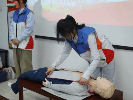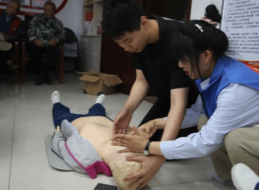 服务队分两组同时进行活动,第一组队员在党群服务中心为中老年人详细讲解了单人成人心肺复苏操作方法及其要领,演示了胸外心脏按压以及人工呼吸的规范操作。讲解结束后,队员们邀请现场人员借助假人模型进行实际操作演练。现场的中老年人积极参与,认真倾听队员们的讲解与指导,很快掌握了胸外心脏按压和人工呼吸的基本操作要领,进一步体会到掌握急救知识的重要性。