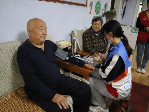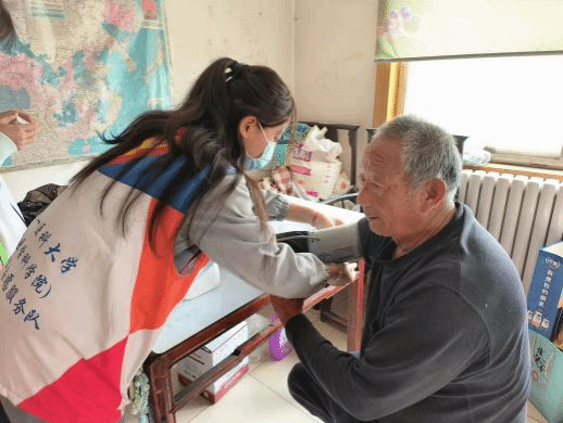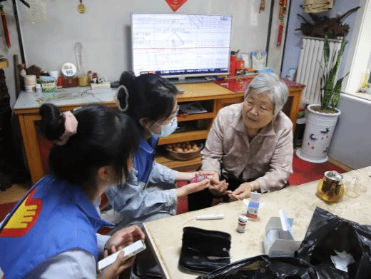 第二组队员跟随社区的工作人员进行入户义诊。队员们运用学到的专业知识和技能,熟练地为居家老人进行血压测量和血糖检测,细心询问老人的饮食情况和过往血压、血糖检测情况,并结合本次测量数值分析老人近期身体状况,进行健康知识普及,叮嘱数值异常的老年人平时饮食注意少油少盐,定期进行健康检测。在测量过程中,大家还与老人谈健康、话家常,进行不同年龄段的经验分享,氛围十分融洽。
