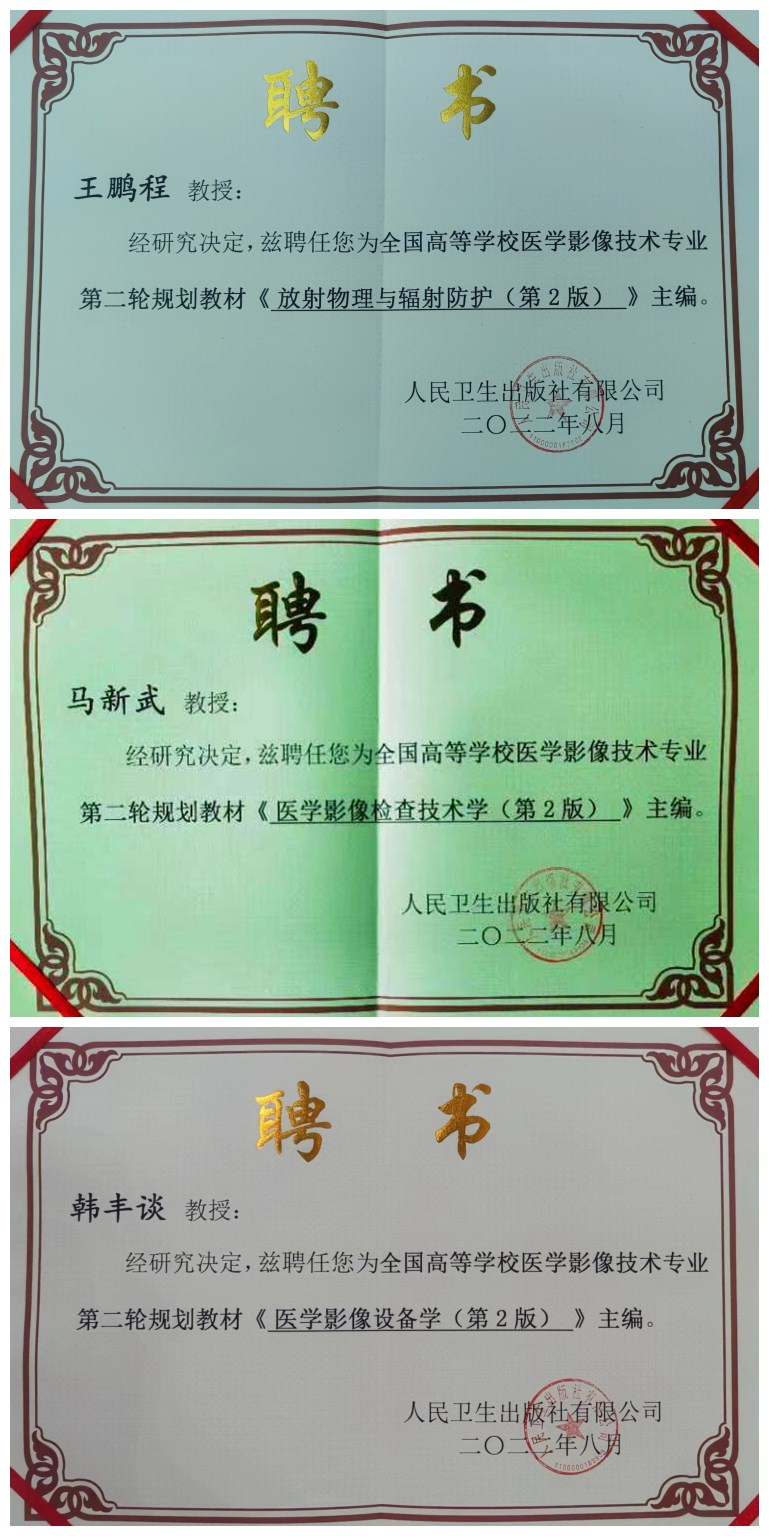 我校(院)3位教授被遴选为教材主编,其中王鹏程教授担任《放射物理与辐射防护》主编,马新武教授担任《医学影像检查技术学》主编,韩丰谈教授担任《医学影像设备学》主编。另外邱建峰教授担任《医学影像成像理论》副主编,张光玉教授担任《医学影像图像处理学》副主编。