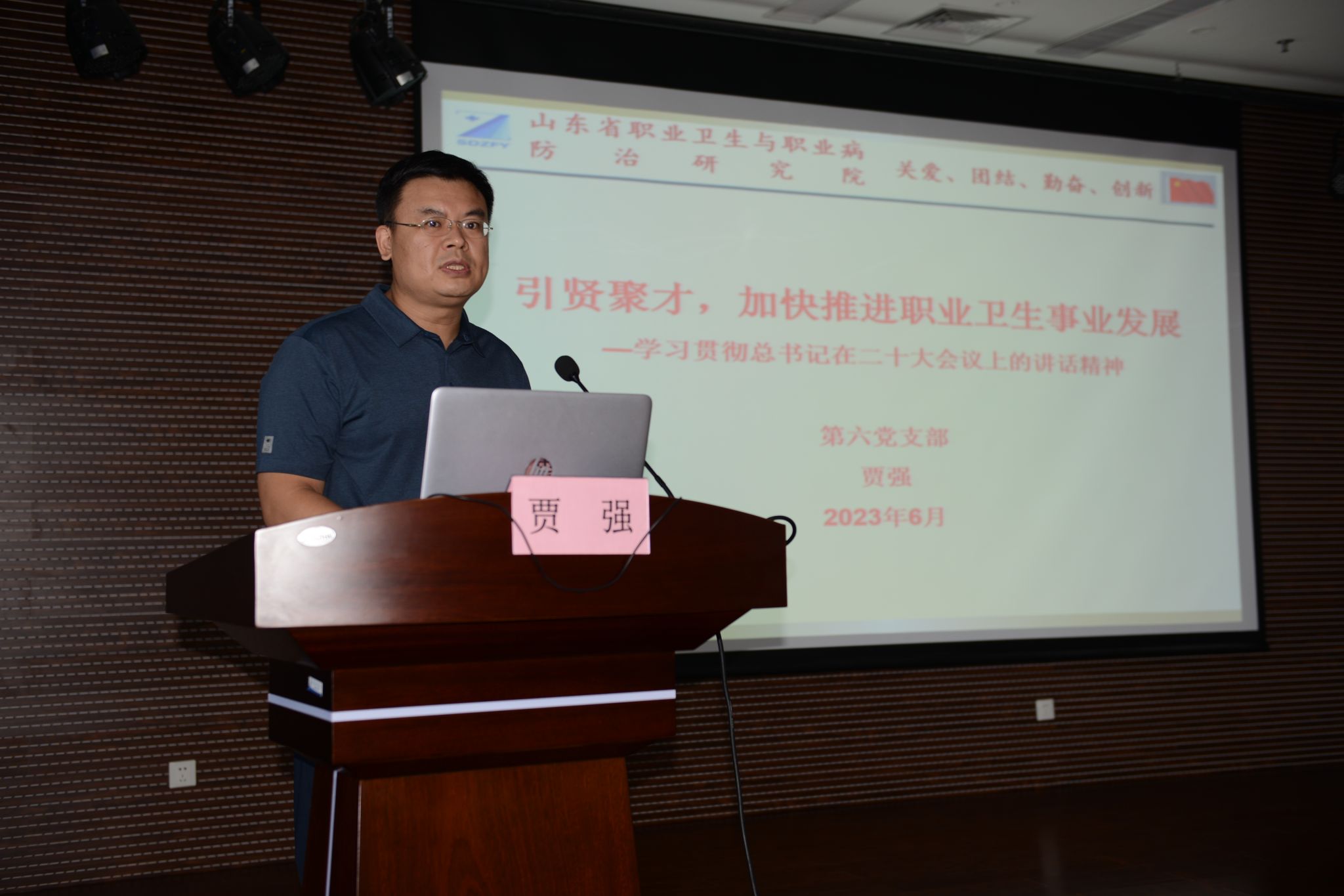 表彰结束后,为深入学习贯彻习近平新时代中国特色社会主义思想主题教育和党的二十大精神,党委委员、副院长贾强作《引贤聚才,加快推进职业卫生事业发展-学习贯彻习近平总书记在党的二十大会议上的讲话精神》党课辅导。党课从深入学习贯彻科教兴国战略,深刻理解教育、科技、人才是全面建设社会主义现代化国家基础性、战略性支撑的根本定位,深刻理解科技是第一生产力、人才是第一资源、创新是第一动力的战略格局以及充分发挥人才引领驱动作用四个方面阐述了引贤聚才的重要性和紧迫性,强调坚持党管人才,发挥人才作用,以高质量党建发展引领人才建设各项工作。