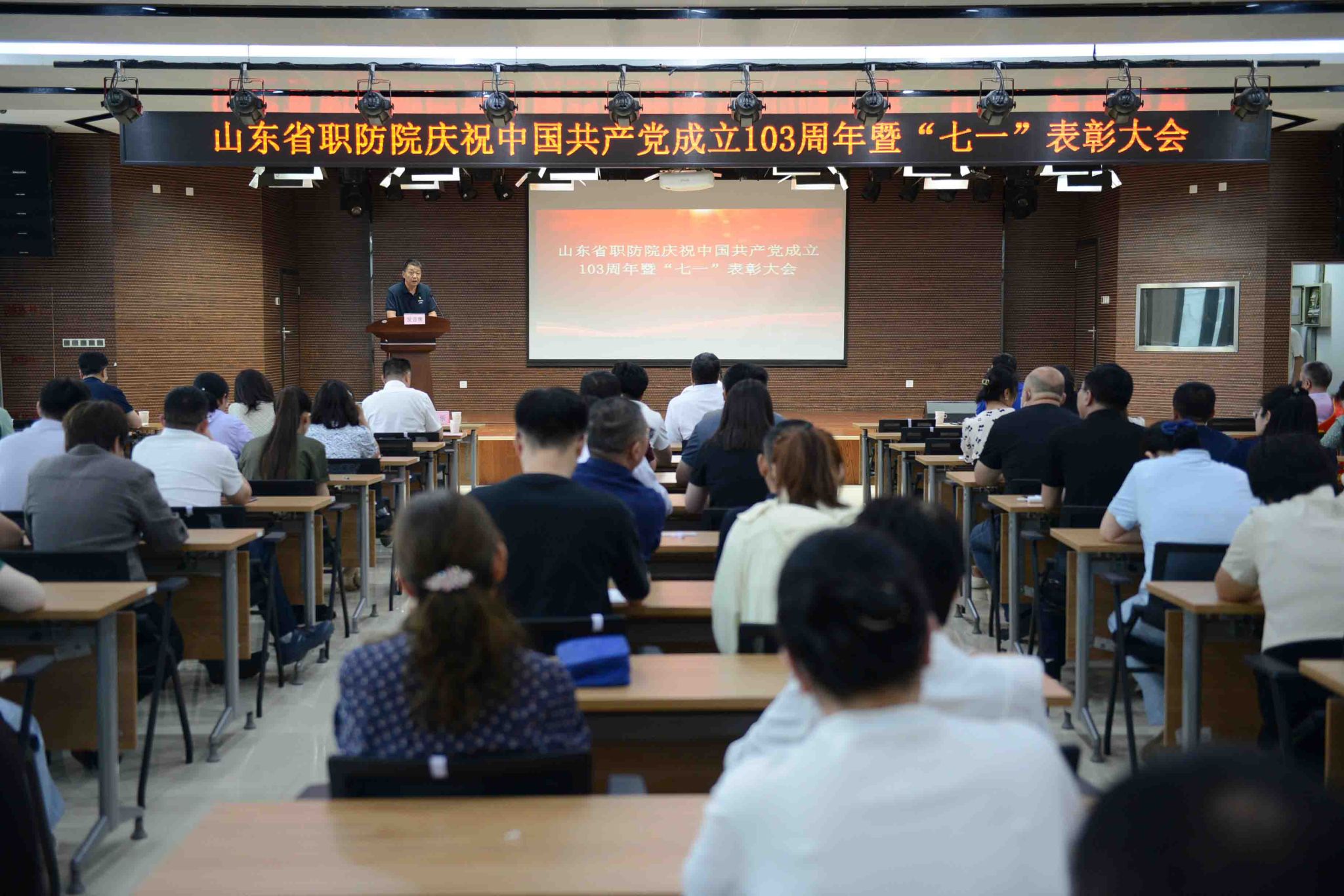 为庆祝中国共产党103年诞辰,7月1日,山东省职防院隆重召开庆祝中国共产党成立103周年暨“七一”表彰大会,铭记党的峥嵘岁月,传承党的优良作风,秉承党的初心使命。全体党员及入党积极分子、中层及以上干部、离退休老干部党员代表参加会议。