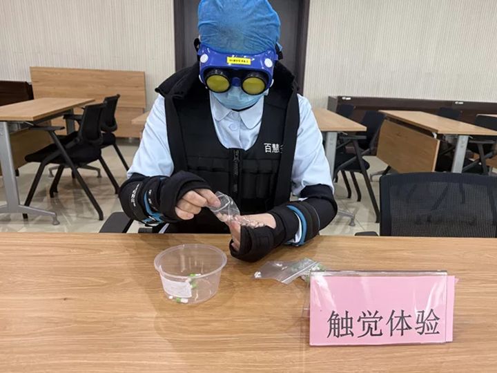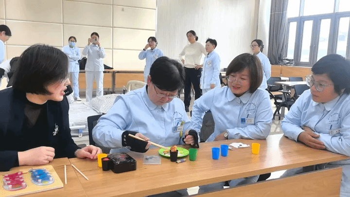 活动以一场关于《老年人常见的健康问题》的专题讲座拉开序幕。老年病护理专科护士生动讲解了老年人生理机能变化及常见健康问题,为后续体验环节打下理论基础。随后,参与者穿戴特制模拟装备,亲身体验老年生活的诸多不便。在视觉体验区,戴上模拟黄斑病变、白内障的眼镜后,阅读药品说明书、穿针引线都变得异常困难;行动体验区,绑上关节沙袋、负重背心,上下床、行走都步履沉重;触觉体验区,手腕被限制后,取药片、捡物品等精细动作也显得笨拙吃力。趣味互动区则通过听力测试、叠杯子等游戏,让大家在轻松氛围中感受老年人听力与记忆力的变化。