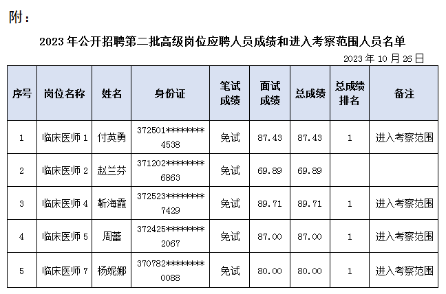 根据中共山东省委组织部、山东省人力资源和社会保障厅《关于印发2023年度省属事业单位公开招聘工作实施方案的通知》(鲁人社发〔2022〕23号)、《山东省事业单位公开招聘工作规程》及我院公开招聘工作方案有关规定,经公开报名、资格审查、面试等程序,现公布附属职业病医院2023年公开招聘第二批高级岗位应聘人员的成绩和进入考察范围人员名单(见附件)。其中,按照“面试采取简化程序的岗位,可设定面试合格分数线,达到分数线的进入考察范围”的规定,经备案同意,设定面试分数线70分。
