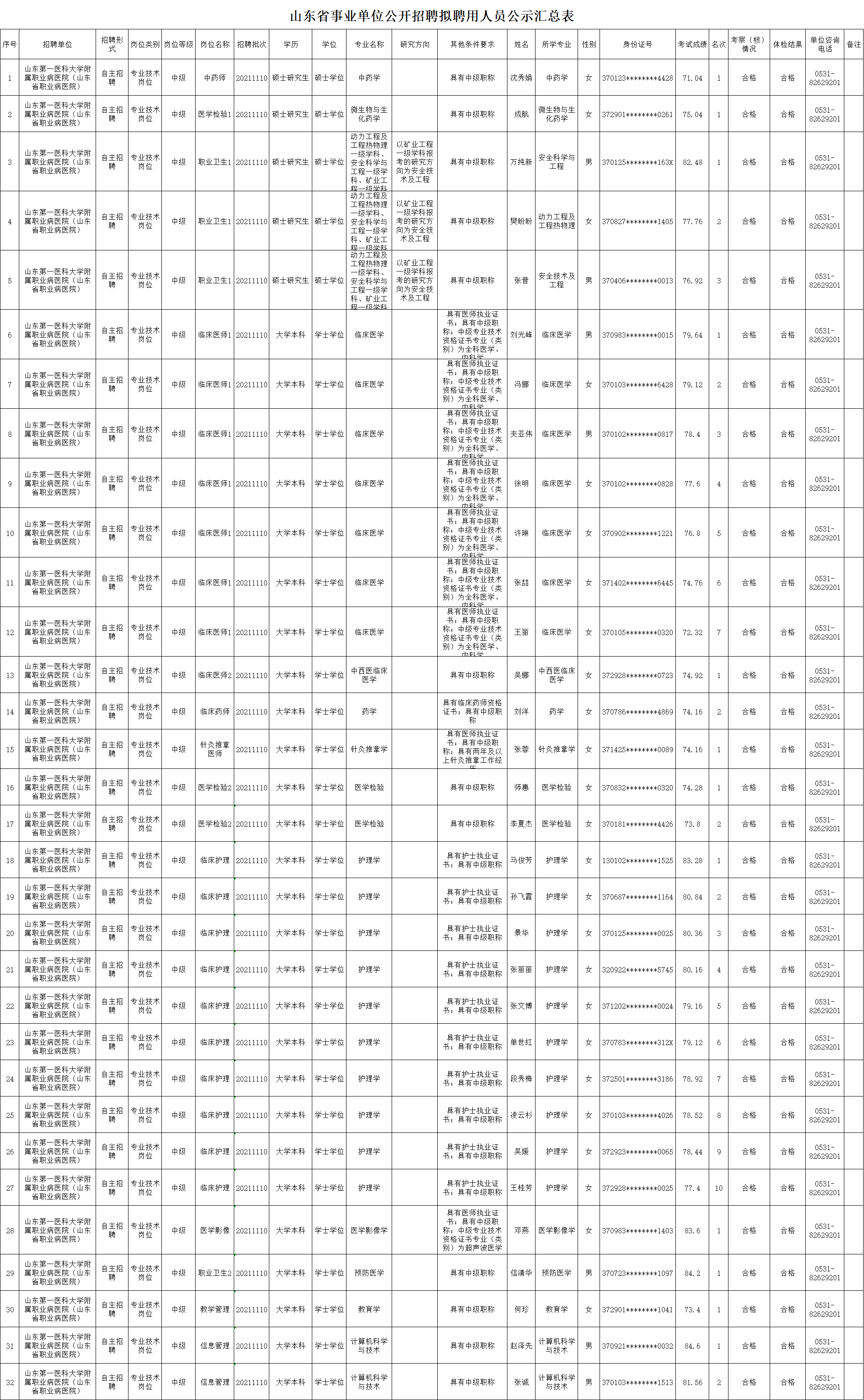 根据中共山东省委组织部、山东省人力资源和社会保障厅《关于印发2021年度省属事业单位公开招聘工作实施方案的通知》(鲁人社发〔2021〕7号)要求,按照岗位招聘计划,bobapp1中国有限公司附属职业病医院(山东省职业病医院)组织完成了公开招聘考试、考察、体检等工作,现对拟聘用人员进行公示。公示期为7个工作日,自2022年4月28日至2022年5月10日(不含节假日)。公示期间,如对公示人选有异议,请及时反映。