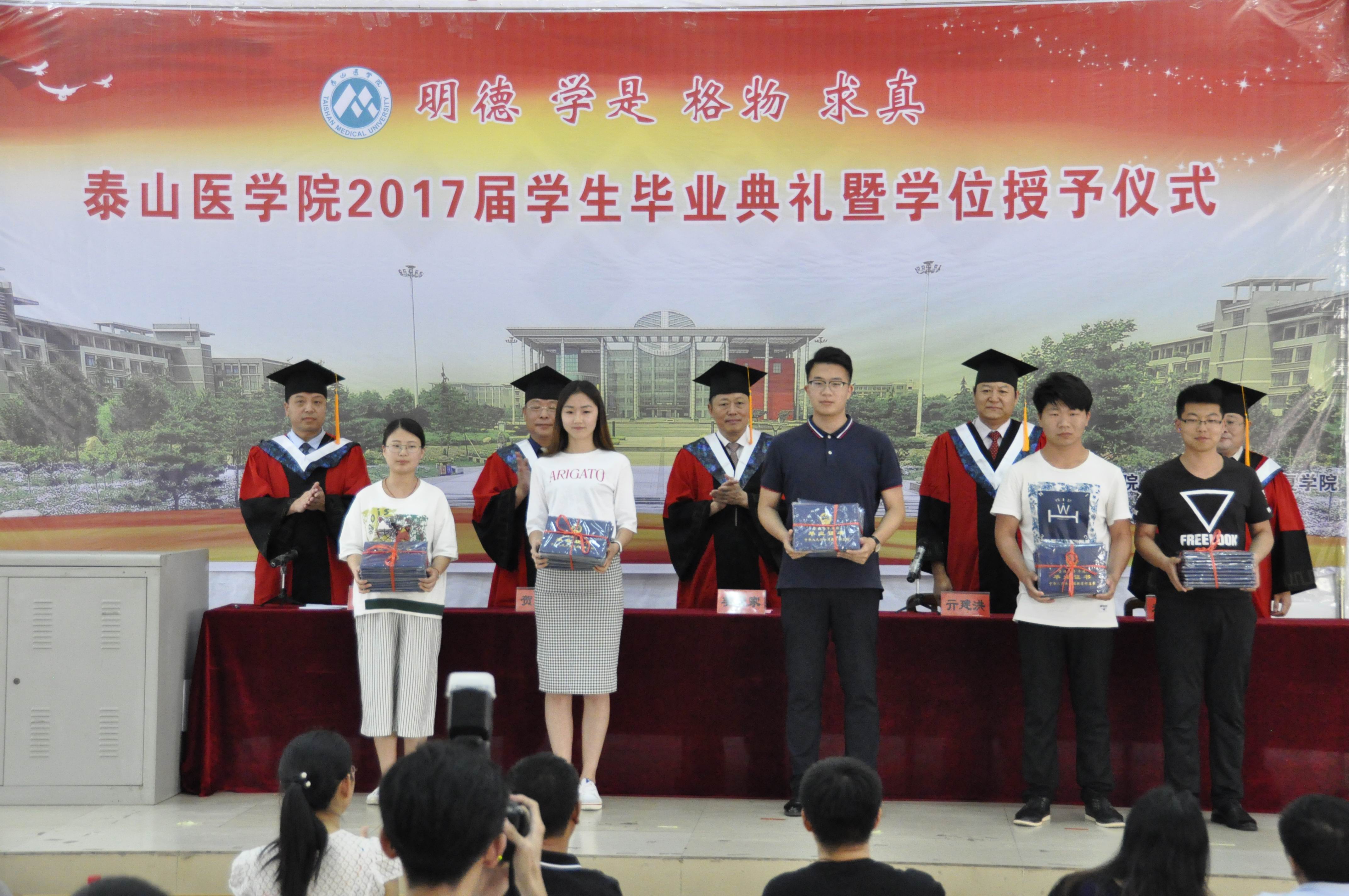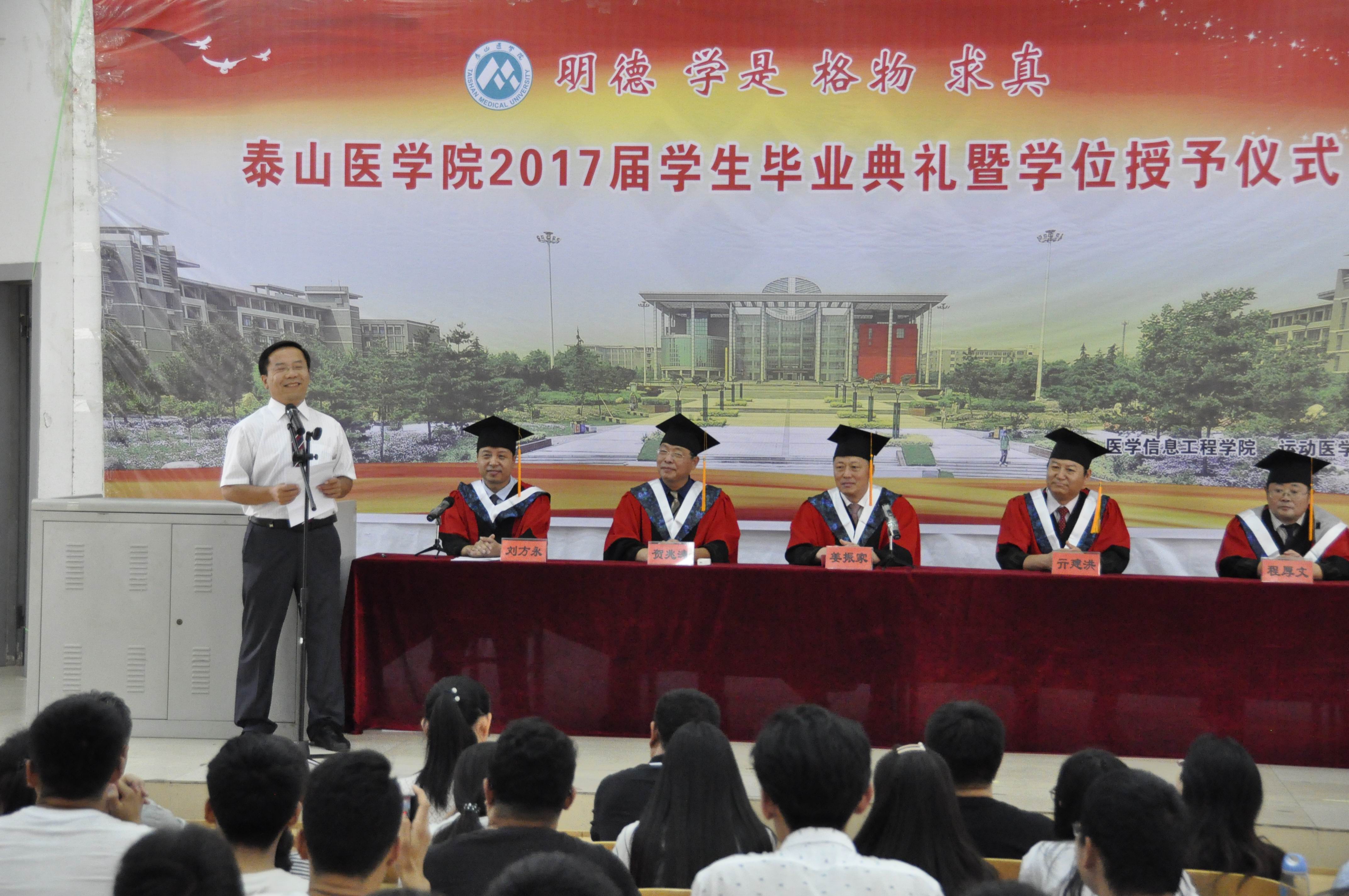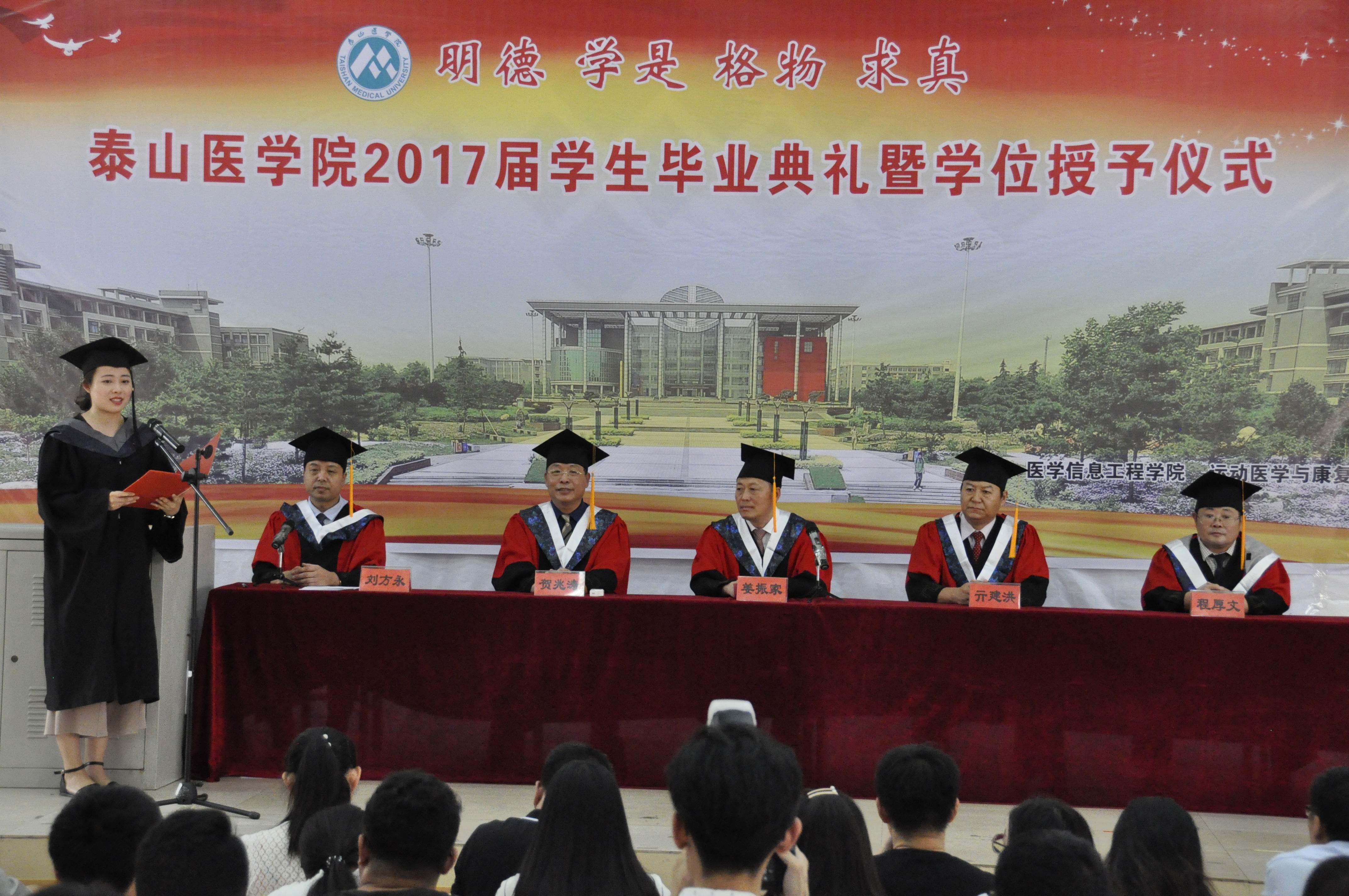 典礼在雄壮的中华人民共和国国歌声中拉开帷幕。亓建洪宣读了《泰山医学院2017届毕业生毕业及学位授予的决定》和毕业生获奖名单。随后,毕业生代表上台,代表全体毕业生领取了毕业证书。