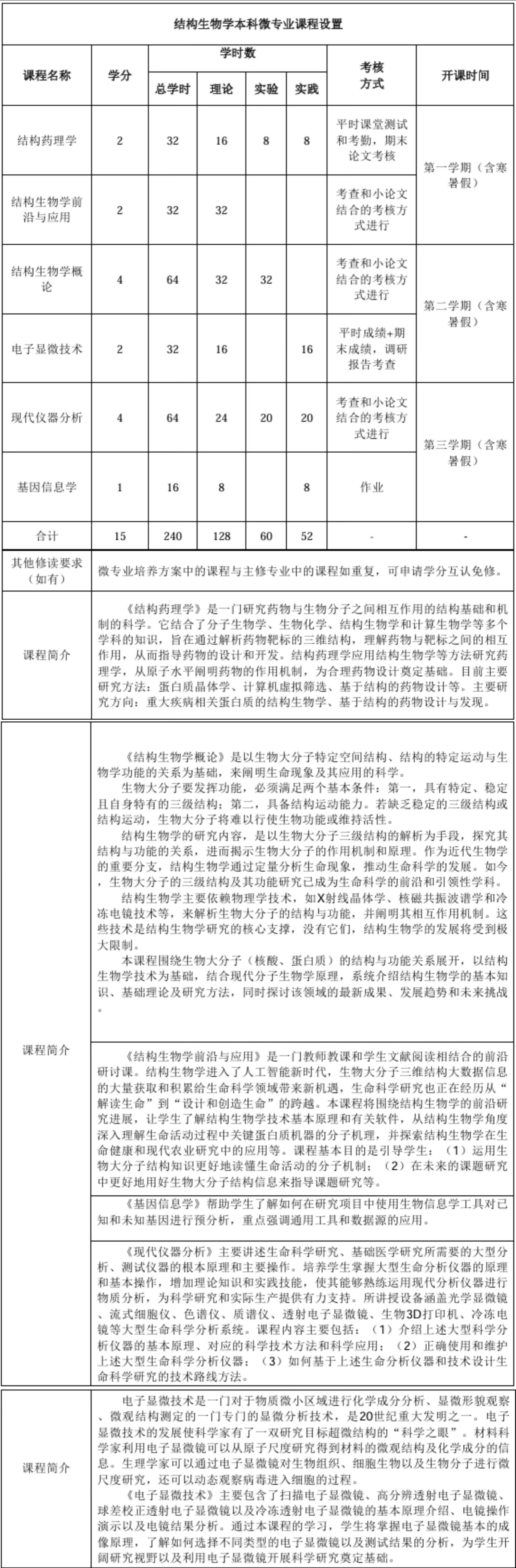 该微专业共计15学分,修读年限为3个学期(含寒暑假),包含《结构药理学》、《结构生物学概论》、《结构生物学前沿与应用》、《现代仪器分析》、《电子显微技术》和《基因信息学》6门课程。