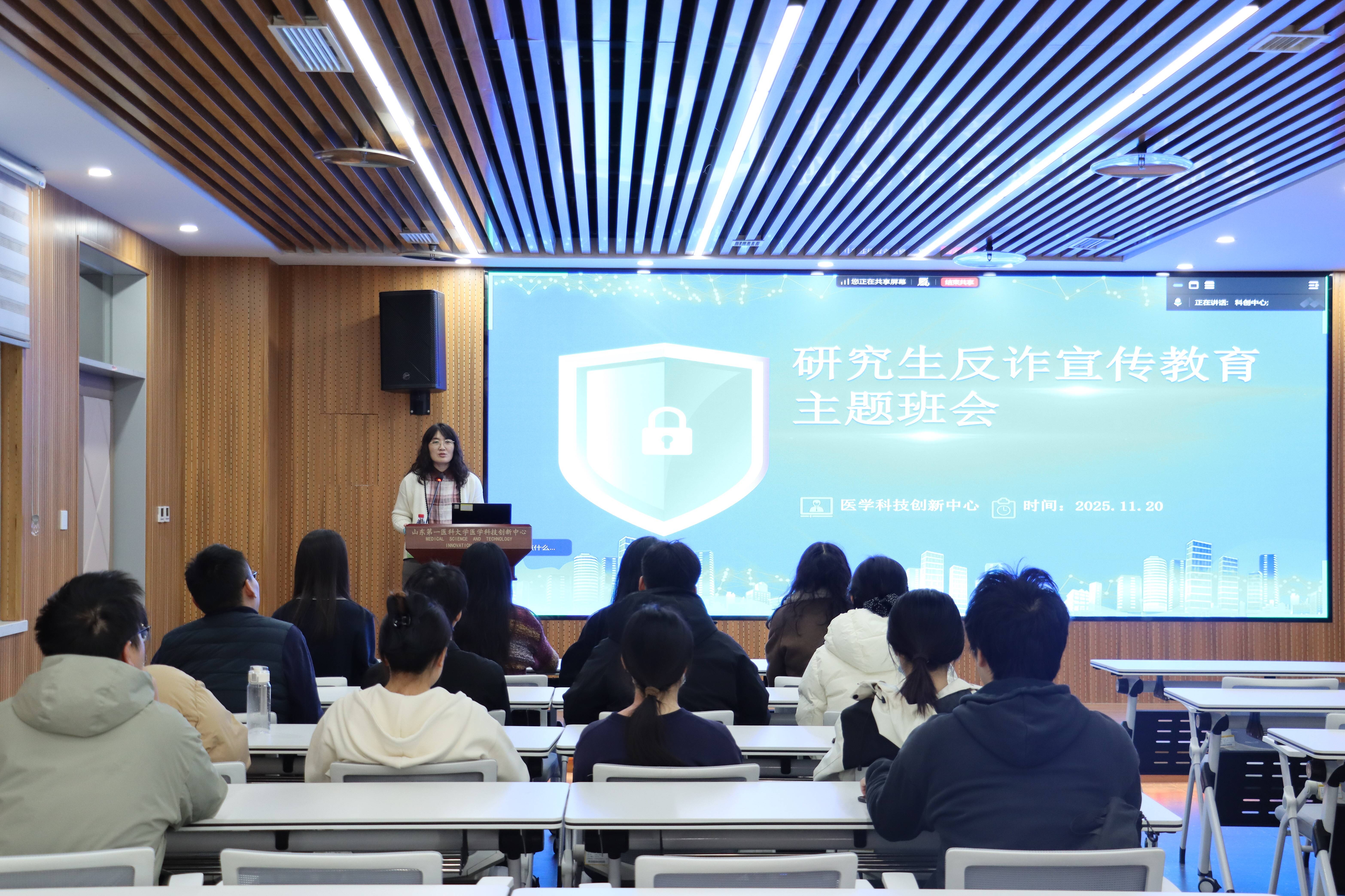 为进一步筑牢校园安全防线,提升研究生群体防范电信网络诈骗的意识与能力,11月20日下午,医学科技创新中心(简称“科创中心”)召开了“研究生反诈宣传教育”主题班会。科创中心常务副主任辛玮出席并致辞,教学秘书王洋洋主持,全体在读研究生参加。