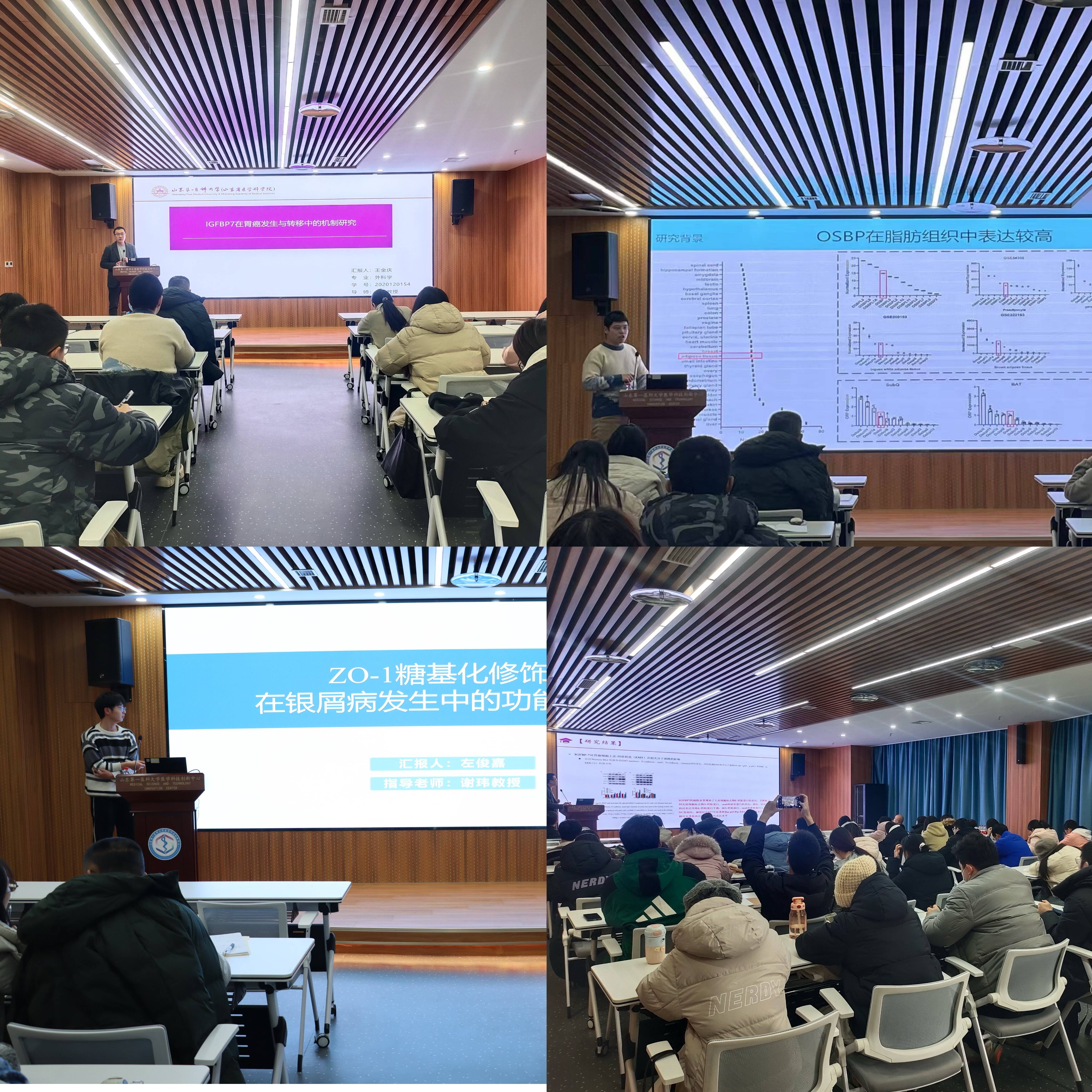 论坛上,2020级博士王金庆、2021级博士王浩安、2023级硕士左俊嘉三位优秀研究生轮番登台,展示科研成果。王金庆阐述了IGFBP7通过调控上皮间质转化促进了胃癌细胞的侵袭和转移,为临床寻找新治疗靶点、延缓疾病进展、改善患者预后提供新的理论依据;王浩安汇报了OSBP在脂肪组织中作为膜接触位点,通过介导溶酶体膜修复进而影响脂肪细胞的存活,为脂代谢研究提供了新思路,其新颖的观点和深入的研究引发了在场师生的热烈讨论;左俊嘉介绍了ogt通过调控zo1的膜定位影响银屑病的发生,为银屑病的治疗提供了新的思路和方向。汇报期间,同学们不仅展现深厚的科研积淀与敏锐的学术眼光,更与在场师生及专家深度对话,充分锻炼表达与沟通能力,科研素养与综合学术能力跃上新台阶,为未来学术之路筑牢根基。