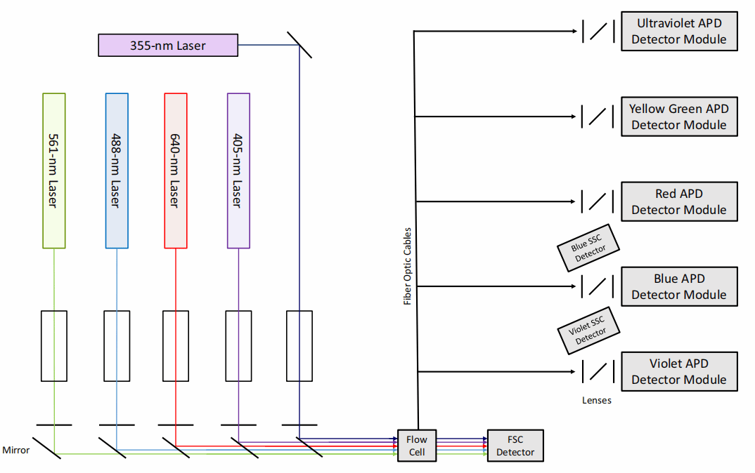 采用高灵敏度粗波分复用(CWDM)半导体检测阵列,可以更有效的检测420-829nm范围内的荧光发射光谱,捕获每个荧光分子在特定波长范围内的全部发射光谱,高带宽电子设计可扩展至64个荧光检测通道,使荧光素的选择与搭配更加灵活简单,能够在单个细胞水平上对超过40个参数进行高通量表征。