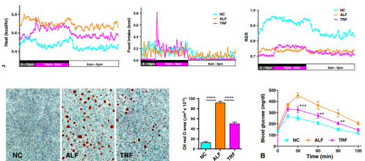 间歇性禁食(intermittent fasting)和时间限制性进食(time-restricted feeding)将食物而不是整体热量摄入,限制在一天的特定时间内。越来越多的证据表明,时间限制进食(TRF),即限制卡路里摄入的时间,以8-12小时的窗口,符合每日的昼夜节律(例如,夜行性小鼠在夜间或黑暗阶段进食),将有可能是另外一种预防代谢性疾病和肥胖的方法。在一项来自美国加利福尼亚大学的研究中,研究人员将小鼠分为正常饲养组(NC)、无时间限制高脂饲养组中(ALF)、16小时限制高脂饲养组(TRF),正如预期,ALF小鼠呼吸熵(RER)为约0.75,基本不变化,表明ALF小鼠在研究期间处于氧化状态,饮食成分与持续摄入量、持续研究时间一致。由于线粒体脂肪酸氧化增加,相较于NC组小鼠,ALF小鼠产生更多热量。TRF小鼠每天禁食16小时,其RER值为0.7(主要反映脂肪氧化),进食8 h后小鼠的RER增加有所,因为在这段时间里摄入了碳水化合物和脂肪。与此同时可以观察到,相较于ALF组小鼠,TRF小鼠肝脏出现的油红脂滴相对较少,胰岛素抵抗水平有所改善,揭示了间歇性禁食可改善肥胖引起的胰岛素抵抗和脂肪肝。
