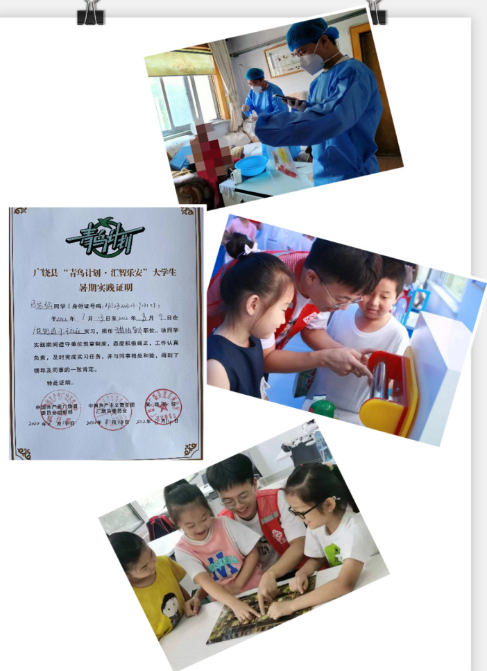 2021级的马岩松同学参与到青鸟计划的社会实践活动中,获得了广饶县广饶街道月河社区的实习机会。进入岗位实习接近一月时间里,参加了爱心学校支教、全员核酸检测等活动。他深刻感悟到:“实习是每个学生顺利走向社会与工作岗位的重要途径。在未来的时间里要坚定理想信念,扎根基层,服务社会,展现新时代大学生的精神风貌。”