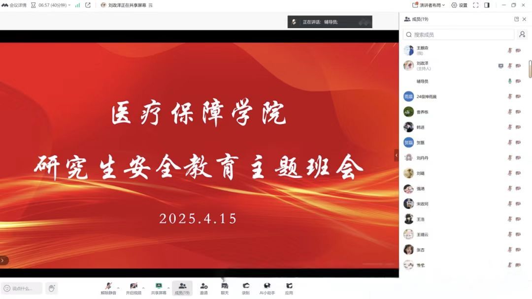 为全面落实校(院)开展校园安全自查工作的要求,筑牢校园安全防线,4月15日下午,医疗保障学院组织全体研究生开展校园安全教育主题班会。班会通过“理论宣讲+案例警示”系统强化学生安全防范意识。